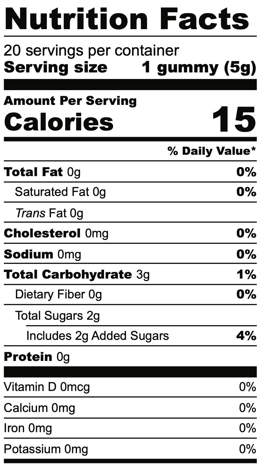 Organic Cane Sugar, Organic Tapioca Syrup, Pectin, MCT Oil, Cannabinoid, Organic (Fruit) Concentrate, Organic Color, Citric Acid